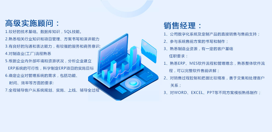 公司诚邀有抱负、有才华的你加盟,并提供广阔的工作舞台,以完整的历练协助你设计完美的职业生涯。以客户的具体需求和客户满意率为服务导向,以完成客户最可信赖的信息化伙伴为服务理念,以指导和协助企业管理信息化成功运转为服务宗旨,致力为客户提供优质而稳健的管理信息化软件产品和服务!